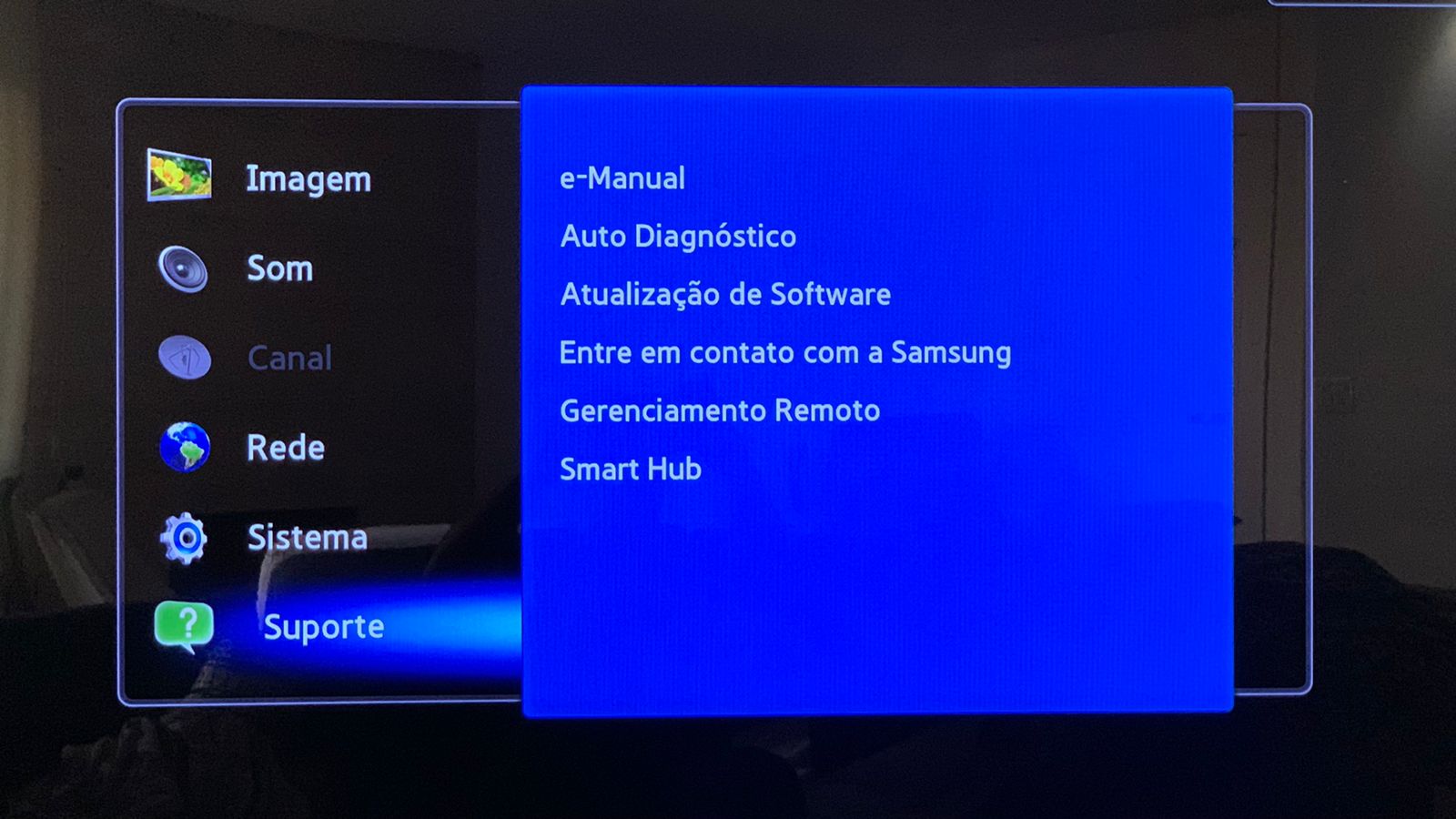 Pelas setinhas do controle, vá até a opção de “Suporte” e depois, entre na opção “Entre em contato com a Samsung
